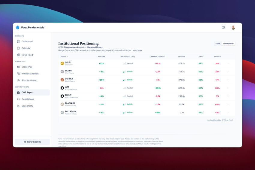 Commodity futures positioning is now fully integrated into the COT Positioning pages. You can track institutional positioning for Gold, Silver, Copper, WTI Crude, Brent Crude, Platinum, and Palladium — the same way you already could for major currencies.